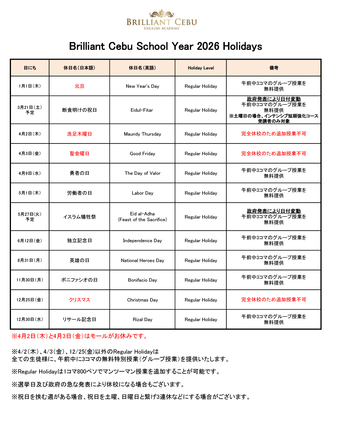 フィリピンは祝日が多い国ですが、ブリリアントセブでは留学期間の学習時間をできるだけ確保できるよう、祝日も原則開校しています。2026年の祝日(Regular Holiday)に関する開校スケジュールは、下記の通りです。